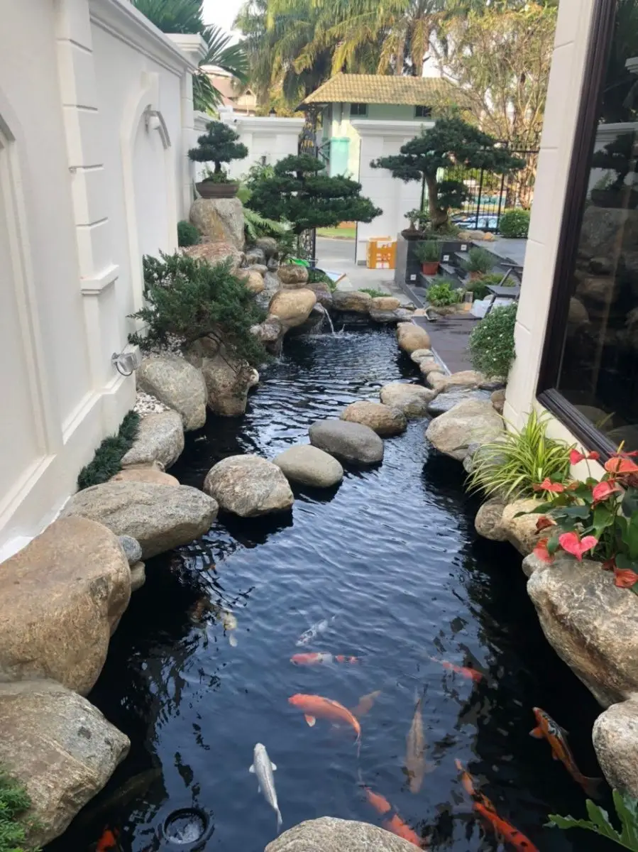 Tiếp theo, hệ thống lọc nước và duy trì sinh thái là yếu tố không thể bỏ qua. Một hồ cá koi đẹp và bền vững cần hệ thống lọc mạnh mẽ, đảm bảo nước luôn trong xanh, sạch sẽ, không gây bệnh tật cho cá. Ngoài ra, các yếu tố như ánh sáng tự nhiên và nhân tạo, cây cảnh, đá, sỏi, các yếu tố trang trí khác… cũng phải được thiết kế hài hòa để tạo nên một cảnh quan sống động, dễ chịu. Đặc biệt, vị trí của hồ trong khuôn viên cần phù hợp về phong thủy, hướng sáng, tránh các tác nhân gây ô nhiễm hoặc thiếu ánh sáng trực tiếp.